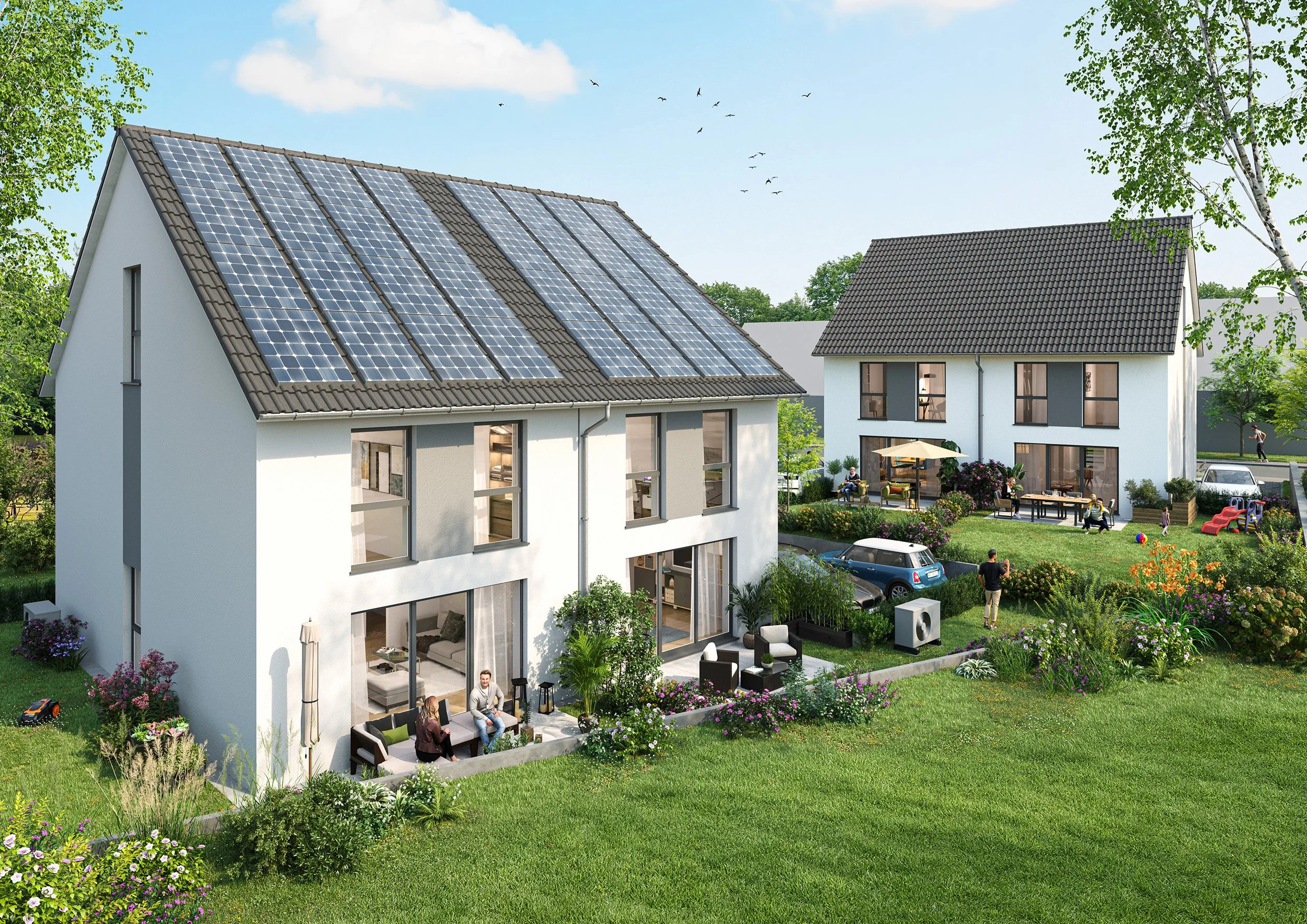 Die Häuser bieten großzügige Wohnflächen, klare Raumstrukturen und private Gärten, die Raum für Alltag, Familie und Zukunft schaffen. Großzügige Fensterflächen sorgen für lichtdurchflutete Wohnbereiche, während hochwertige Materialien und eine sorgfältige Ausstattungswahl den Anspruch an Qualität und Langlebigkeit unterstreichen.